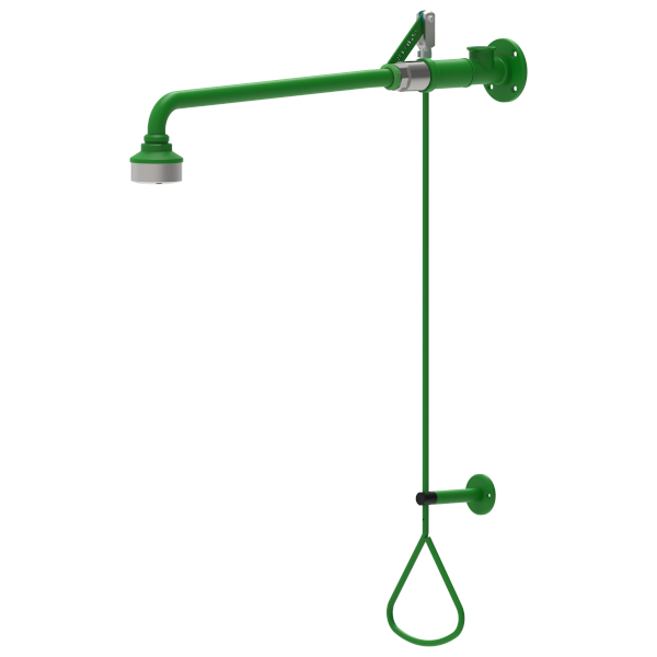 Chuveiro de emergência com válvula esférica e acionamento por haste de ligação, para montagem à superfície, ligação de água por todos os lados