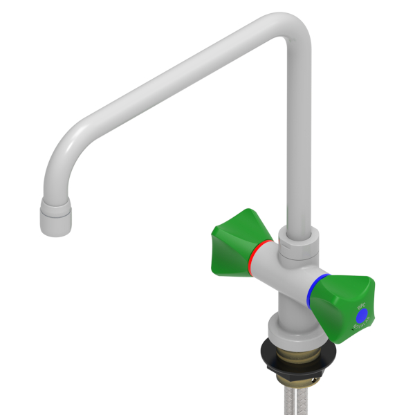 Torneira de água fria/quente (WPC/WPH) com bica rotativa (ângulo reto), comprimento A=250 mm, com arejador, vedante cónico, ligações EPS com pintura eletrostática a pó (cinza RAL 7035), cor de acordo com a EN 13792, para bancadas até 35 mm de espessura, rosca de ligação M33x2, comprimento de 40 mm, vedante e porca. Estão incluídas mangueiras de ligação de 600 mm de comprimento com porcas G3/8; pressão estática máxima de 10 bar. Nota: Também está disponível uma versão com azeitona.