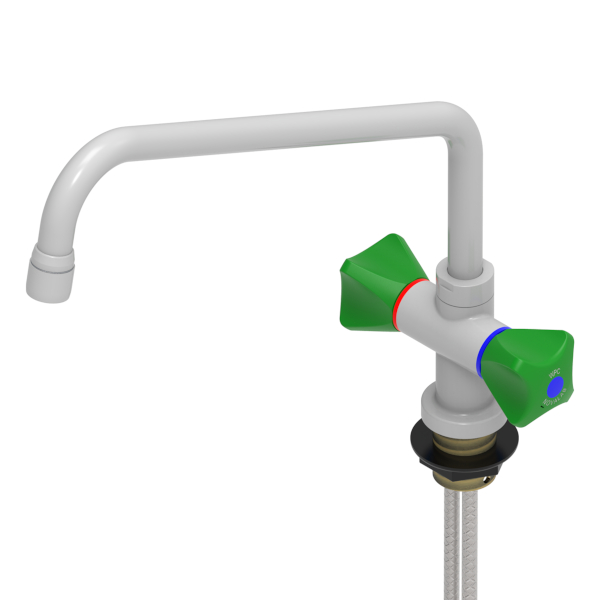 Torneira de água fria/quente (WPC/WPH) com bica giratória de 300 mm, arejador, vedante cónico, ligações com revestimento em pó EPS (cinza RAL 7035), com código de cores de acordo com a EN 13792, para bancadas até 35 mm de espessura, rosca de ligação M33x2, 40 mm de comprimento, vedante e porca. Inclui mangueiras de ligação de 600 mm de comprimento com porcas G3/8; pressão estática máxima de 10 bar.