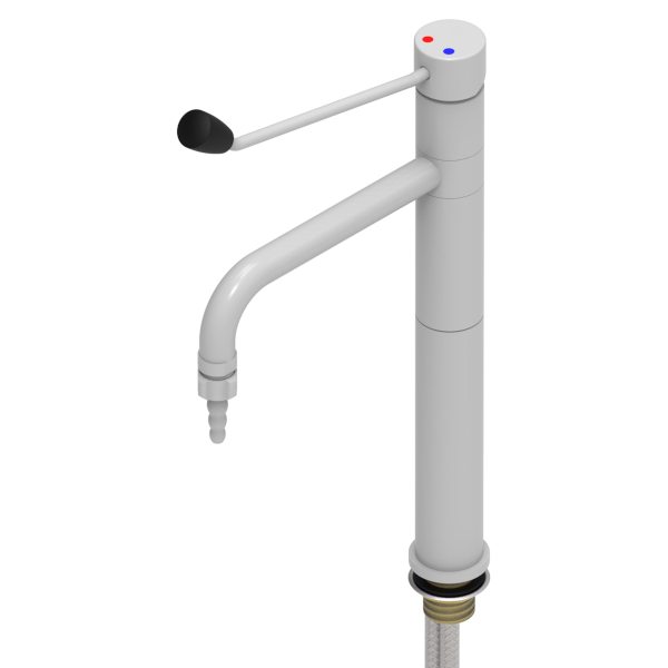 Torneira de água fria/quente (WPC/WPH) com cotovelo (barra de tração com tampa) e bica giratória (ângulo reto), comprimento A = 200 mm, altura A = 300 mm, com oliva, vedante cónico, ligações EPS com pintura eletrostática a pó (cinza RAL 7035), rosca de ligação M32x1, comprimento 38 mm, vedante e porca. Estão incluídas mangueiras de ligação de 400 mm de comprimento com porcas G3/8.
